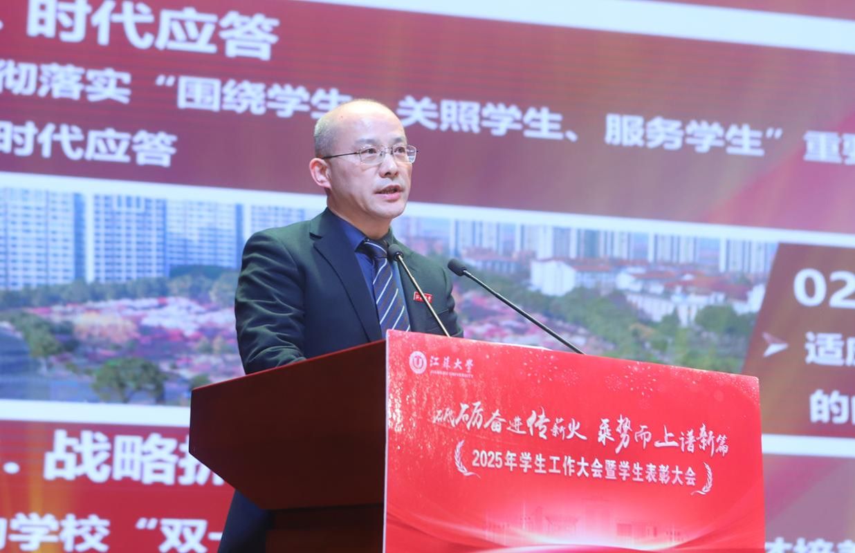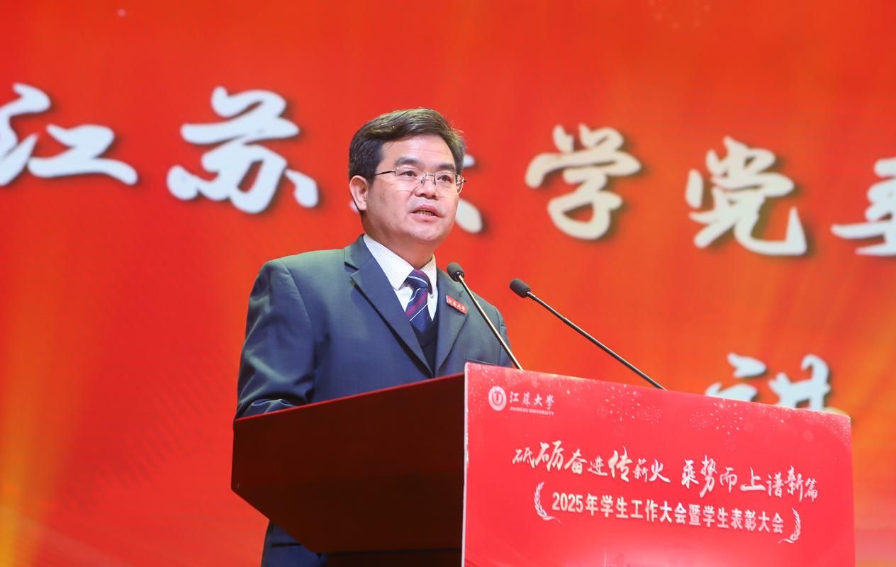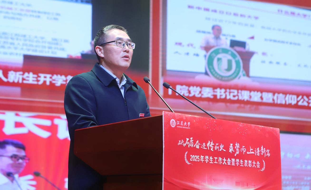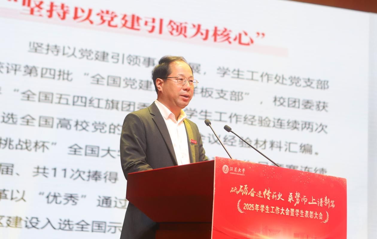 李洪波在大会上发表讲话,代表学校向辛勤耕耘在学生工作一线的同志们致以崇高敬意,向获得表彰的集体和个人表示热烈祝贺,向全校青年学子致以亲切问候。李洪波说,学生工作是落实立德树人根本任务的重要支撑。过去一年,学校学生工作成果丰硕,展现了师生开拓进取、团结奋进的精神风貌。江大学子在求知问学、创新实践、服务社会的广阔舞台上奋发有为,涌现出一大批先进典型。李洪波指出,学校正处在“十四五”收官、“十五五”谋划的关键时期,也是奋力推进“双一流”创建的攻坚期。面对新形势新任务,学生工作必须把握新要求、展现新作为,努力为学校奋进一流提供坚强支撑。他强调,今后一个时期的学生工作要把准方向、聚焦重点,以更高标准提升育人实效;要建强队伍、激发活力,以更实举措打造育人铁军;要激扬青春、筑梦未来,以砥砺奋斗书写人生华章。李洪波希望师生以更加饱满的热情、更加务实的作风,扎实奋斗、砥砺前行,共同谱写学生工作高质量发展的新篇章,努力为学校“双一流”创建和特色鲜明高水平大学建设作出新的更大贡献。