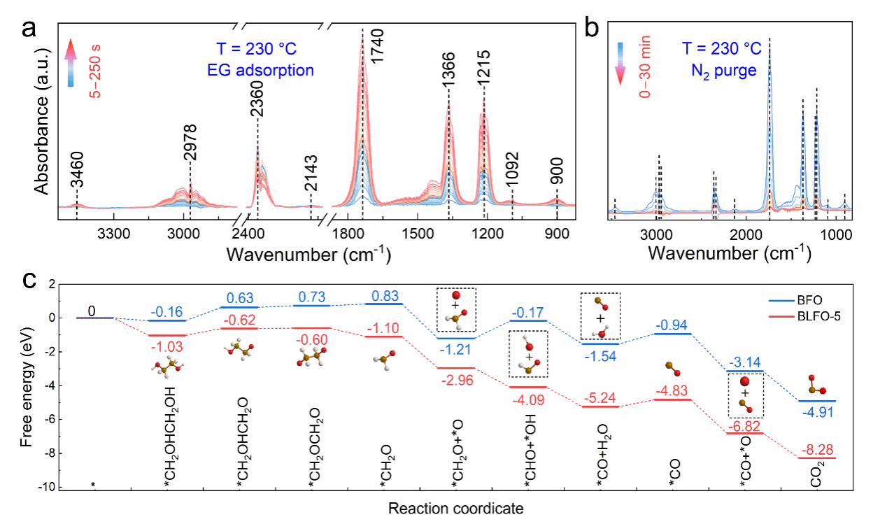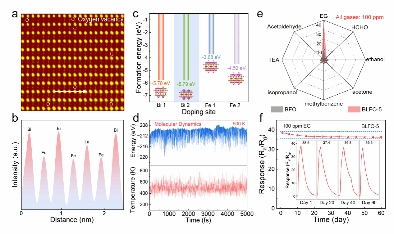 莫来石型Bi₂Fe₄O₉具有无毒、成本低、热稳定性和化学稳定性好等优点,在可持续电子器件领域颇具潜力;其结构中的有序氧空位通道也为气体传感提供了有利条件。该研究以Bi₂Fe₄O₉为基底,通过高通量DFT计算,基于最小形成能筛选出结构稳定的La掺杂Bi₂Fe₄O₉(La-Bi₂Fe₄O₉),并利用分子动力学模拟进一步验证了其稳定性。随后,采用一步水热法制备了La-Bi₂Fe₄O₉材料。借助原子分辨率成像、微化学分析与DFT计算,研究证实La均匀掺杂于Bi位,有效提升了材料表面氧空位浓度和气体吸附能力。气敏性能测试表明,5%La掺杂的Bi₂Fe₄O₉(BLFO-5)传感器对EG表现出超高选择性、优异的重现性和长期稳定性,同时实现了极低的实际和理论检测限。