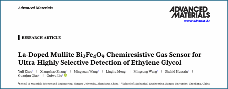 近日,材料学院/农业工程学部乔冠军教授团队在材料领域顶级期刊Advanced Materials上在线发表了题为La Doped Mullite Bi₂Fe₄O₉ Chemiresistive Gas Sensor for Ultra High Selective Detection of Ethylene Glycol的研究论文。材料学院博士生赵玉立为论文第一作者,材料学院刘桂武教授、乔冠军教授及机械学院青年教师王明渊博士为通讯作者。江苏大学为论文唯一完成单位。