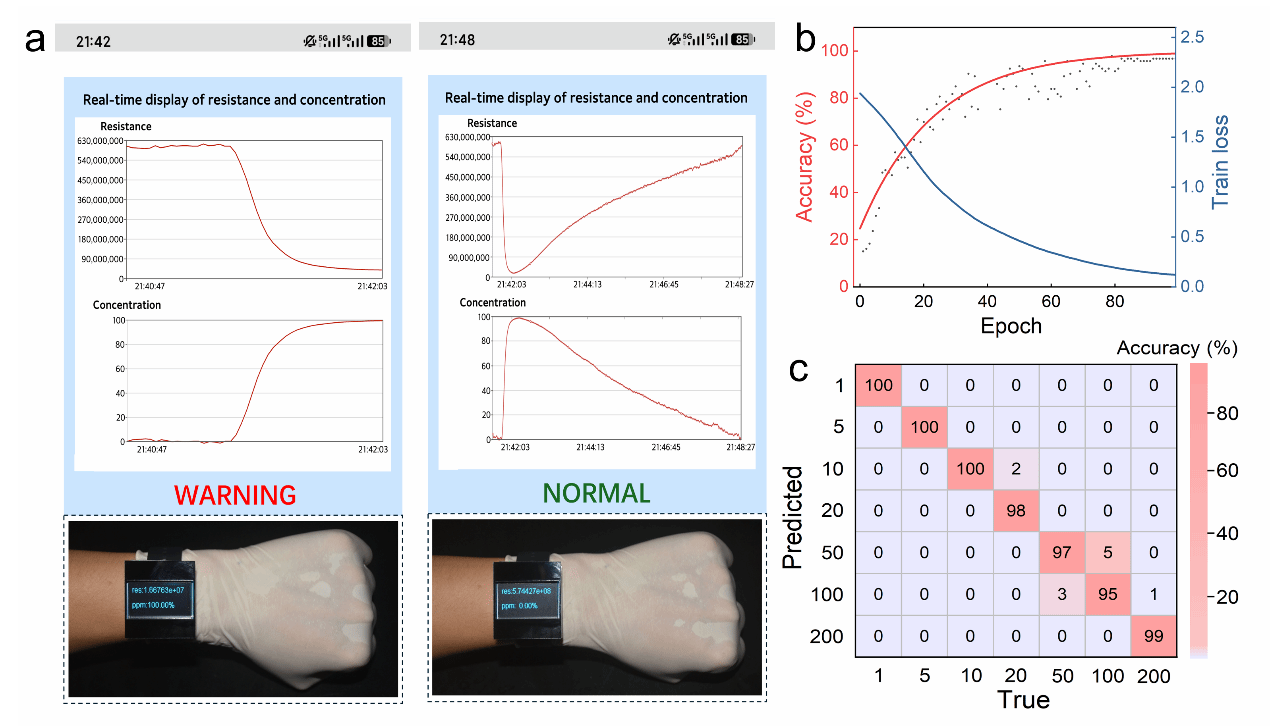结合原位红外与DFT计算,研究进一步揭示了EG在材料表面的催化氧化路径:La掺杂促进EG脱氢生成*CH₂OHCH₂O中间体,继而经Langmuir-Hinshelwood途径完全氧化为CO₂。最后,基于ESP32-C3微控制器构建了可穿戴实时气体监测平台,并在实际环境中结合深度学习算法,将气体识别准确率提升至96.8%。