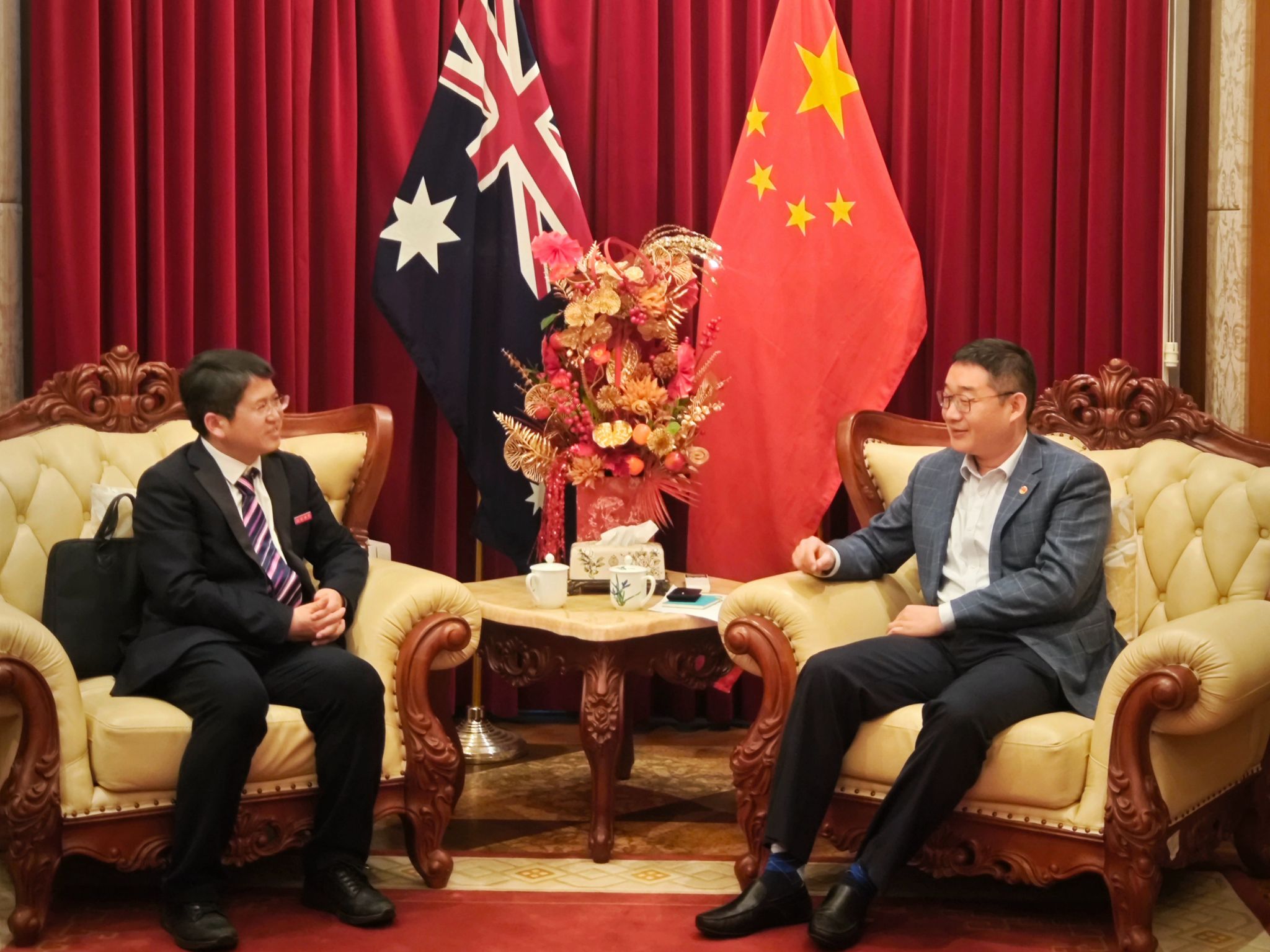 代表团拜会了中华人民共和国驻墨尔本总领事馆,裴贵春副总领事会见邹小波一行。邹小波介绍了学校近年来的办学成就、国际化战略以及与迪肯大学的合作现状与未来规划,希望总领事馆后续在我校与维州高校开展校际合作、引才引智等重点领域继续给予指导。裴贵春对江苏大学与迪肯大学开展的务实合作给予充分肯定,表示总领事馆将继续为江苏大学与维州教育界的交流合作提供支持与帮助。