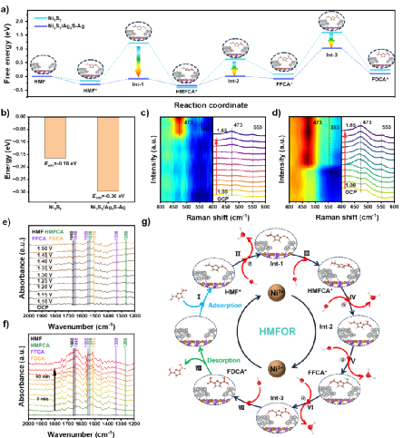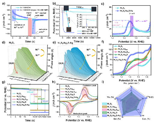 5-羟甲基糠醛 (HMF) 电化学氧化制备高价值的 2,5-呋喃二甲酸 (FDCA) 是一种可持续的石油衍生单体合成途径,然而,如何优化吸附和调控界面以促进 HMF 氧化反应 (HMFOR) 仍然是一个关键挑战。本研究在金属-载体界面成功制备了一种独特的 Ag2S 界面结构(命名为 Ni3S2/Ag2S-Ag),该结构能够有效调控 Ag 和 Ni3S2 的表面性质。独特的 Ag2S 界面层作为电子桥,促进了电子从 Ni3S2 向金属 Ag 的定向转移,从而提高了 Ni 位点的活化效率。在Ni3S2/Ag2S-Ag催化剂中,动态Ni2+/Ni3+驱动的HMFOR反应在HMFOR耦合4-硝基苯酚还原体系(4-NPRR)中实现了工业级电流密度(549.7 mA·cm-2)和高法拉第效率(FE)(266小时再生后,HMFOR的FE为90.2%,4-NPRR的FE为83.5%)。原位拉曼光谱证实了价态驱动的间接氧化机制。密度泛函理论计算和瞬态电化学分析表明,金属相(Ag)可显著优化了底物吸附。此外,研究进一步证实了Ni3S2/Ag2S-Ag催化剂的失活原因,并提出了有效的再生方法。因此,本研究开发的再生双功能催化剂为大规模可持续生产高附加值化学品提供了一种可行的策略。