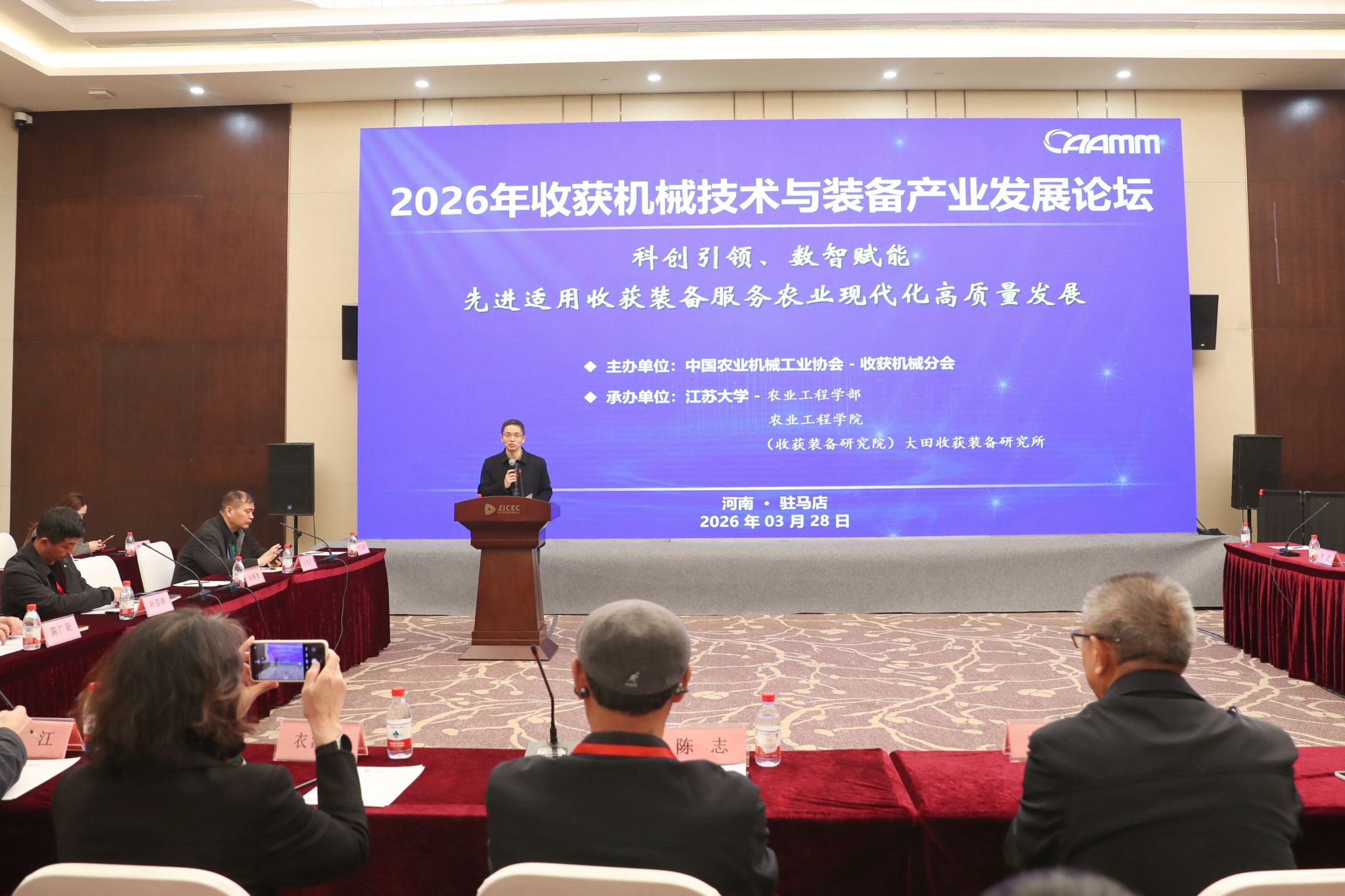 3月28日,由中国农业机械工业协会收获机械分会主办、江苏大学承办的“2026年收获机械技术与装备产业发展论坛”在驻马店国际会展中心召开。来自40余家高校、科研院所、农机企业代表和专家学者齐聚一堂,围绕收获机械技术创新与产业发展开展深入交流。中国农业机械工业协会原会长、专家委员会主任陈志研究员,中国农业机械工业协会副会长宁学贵、副秘书长肖俊华等出席了本次论坛。