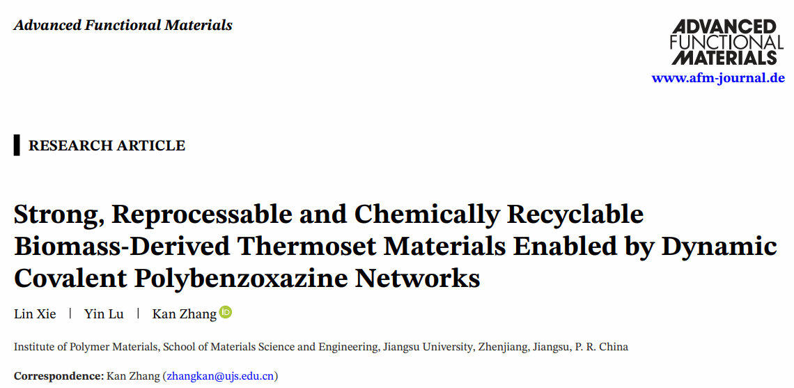 近日,材料科学与工程学院张侃教授课题组在国际材料顶级期刊Advanced Functional Materials在线发表题为Strong, Reprocessable and Chemically Recyclable Biomass-Derived Thermoset Materials Enabled by Dynamic Covalent Polybenzoxazine Networks的最新研究成果。江苏大学为论文唯一完成单位,材料科学与工程学院博士生谢琳为第一作者,张侃为论文通讯作者。