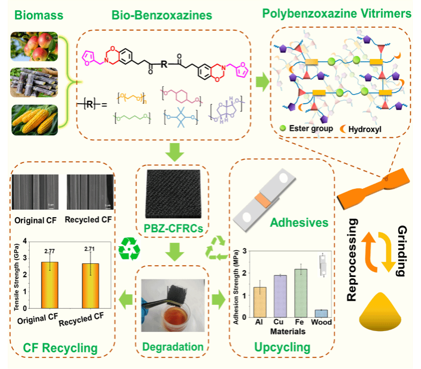 该研究首次实现生物基苯并噁嗪树脂在碳纤维复合材料领域的高效回收应用,构建了碳纤维复材全生命周期循环体系,不仅为可持续先进热固性树脂的开发提供新思路,更为高端碳纤维复合材料的绿色升级奠定理论与技术基础。