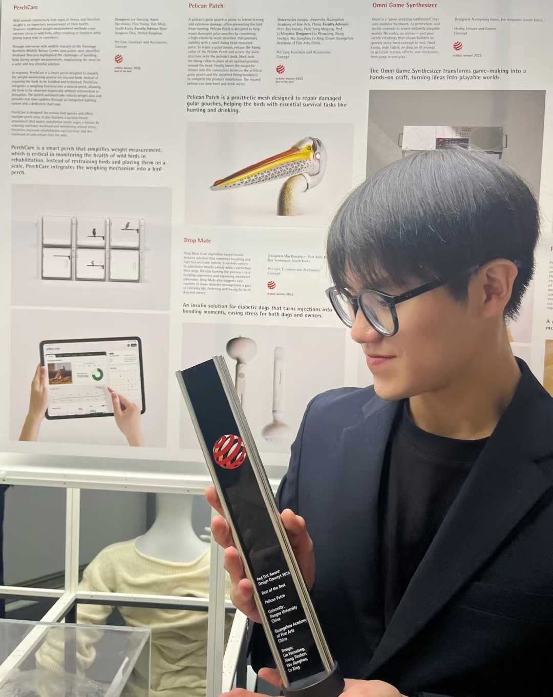 这支由江苏大学林文翔、吕行、向铁宸及东莞理工学院吴炅昊组成的年轻团队,凭借为受伤鹈鹕设计的人工喉囊义体“Pelican Patch”,从全球众多专业设计师与顶尖团队的角逐中脱颖而出,斩获2025年德国红点设计大奖最高荣誉——“红点至尊奖”。