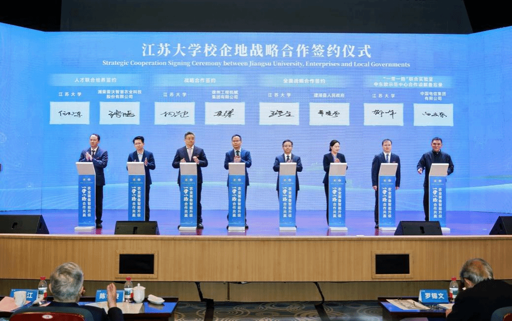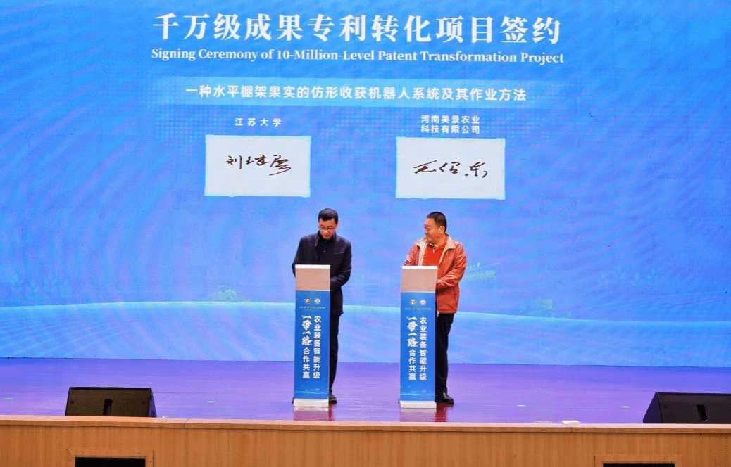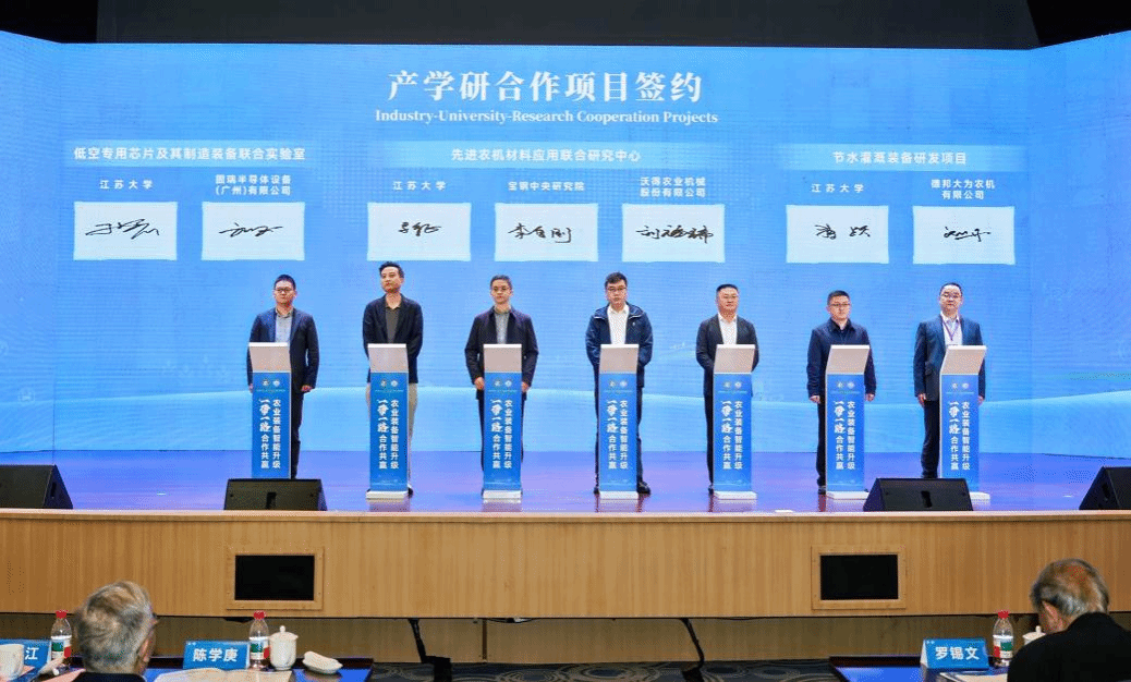 成果转化跑出加速度。会议现场签约成果丰硕,多项千万级、重量级产学研合作落地见效。其中,“一种水平棚架果实的仿形收获机器人系统及其作业方法”发明专利以 1050 万元成功许可转化,将加速葡萄多用管理机器人产业化进程;江苏大学与徐工集团、潍柴雷沃、中国电信、建湖县人民政府等签署校企、校地战略合作协议,围绕智能农机研发、产业示范中心建设、区域产业升级等开展深度合作;与宝钢股份、固睿半导体、德邦大为等企业共建研究中心、联合实验室,聚焦先进农机用钢、低空专用芯片、高效喷灌装备等关键技术协同攻关。此外,《长三角智能农机装备产业协同发展白皮书》正式启动,将为区域产业协同跃升、核心技术攻关、生产性服务业赋能、装备出海布局提供科学指引。